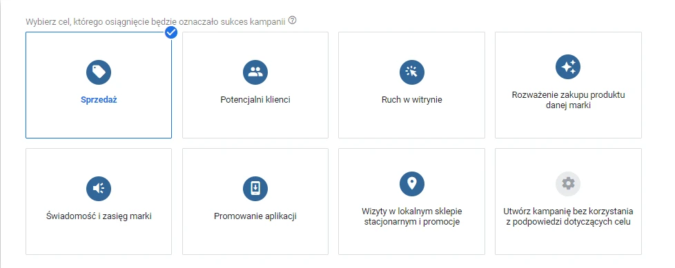 Sprzedaż jest jednym z najważniejszych celów wybieranych przez branżę e-commerce. Prowadzenie handlu internetowego skupia się przecież w największym stopniu na sprzedaży, a uzyskanie jej wysokiego poziomu stanowi o sukcesie. W ramach celu „Sprzedaż” dostępne są następujące typy kampanii: